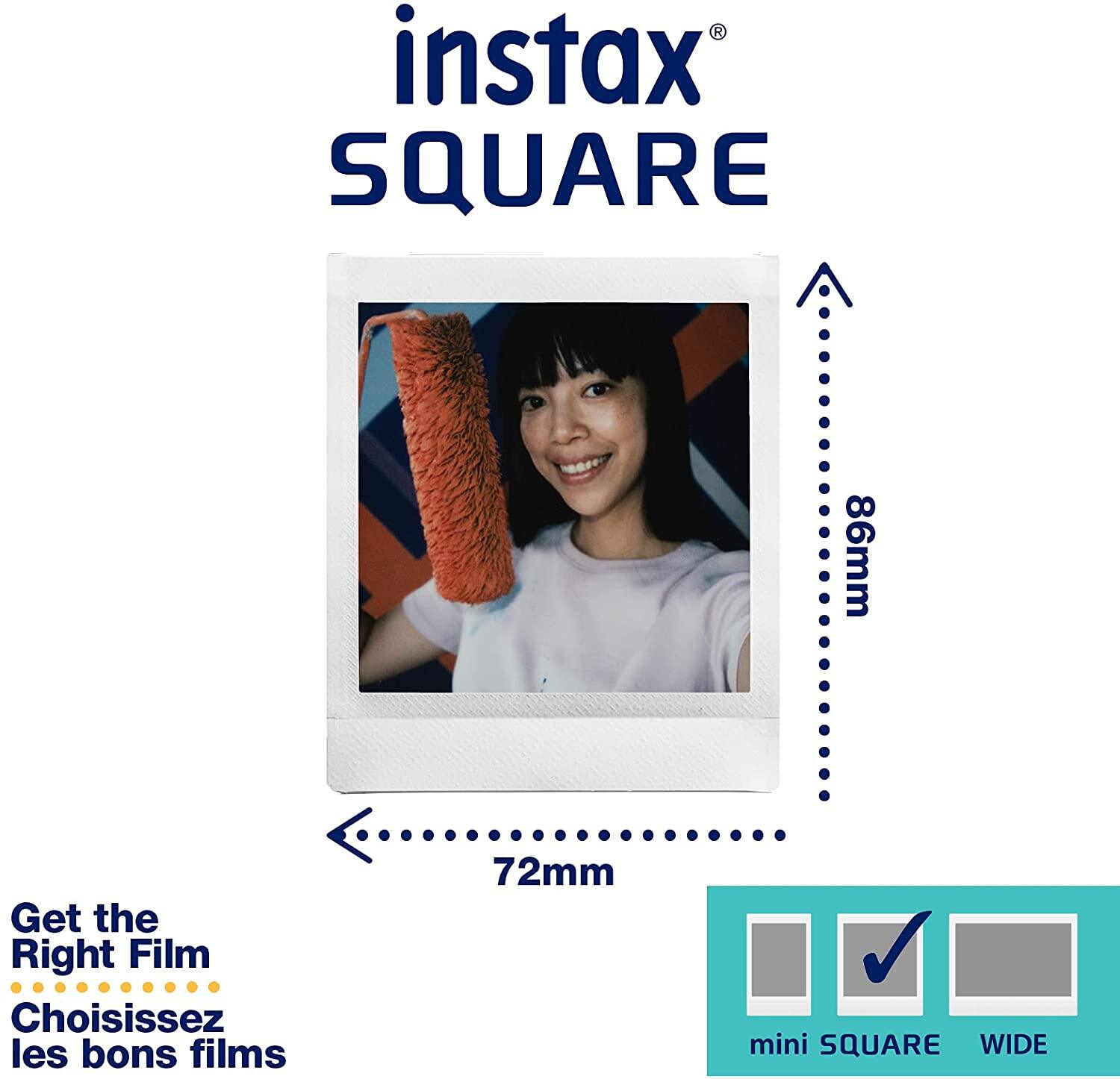 "instax SQUARE film" is for use in only square format instant print cameras such as the new SQ6 SQ10 SQ20. This film offers stunning instant pictures that you can fit into a purse, wallet or mini photo frame. Instax film ensures sharp, clear reproduction, vivid color and natural skin tones.