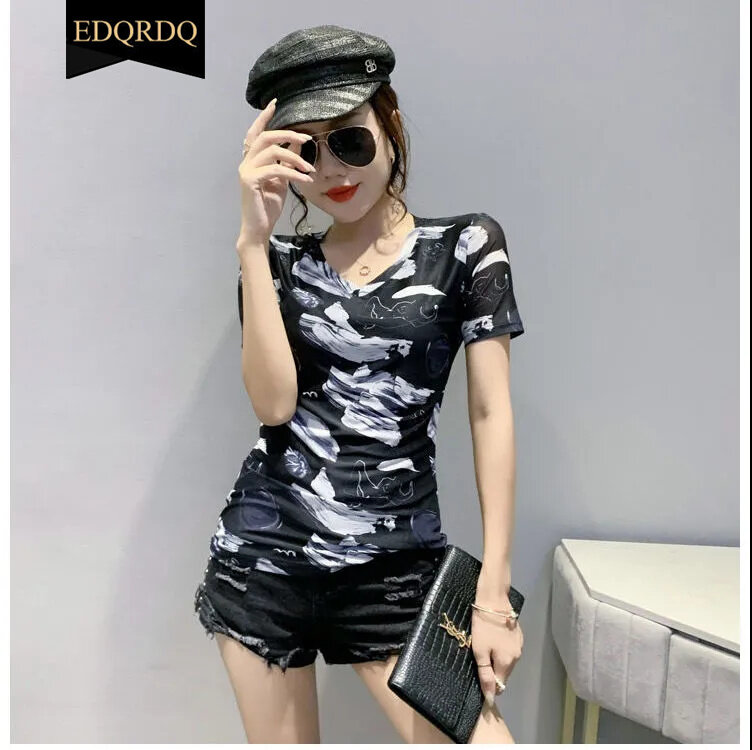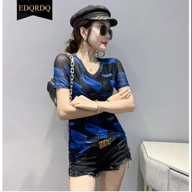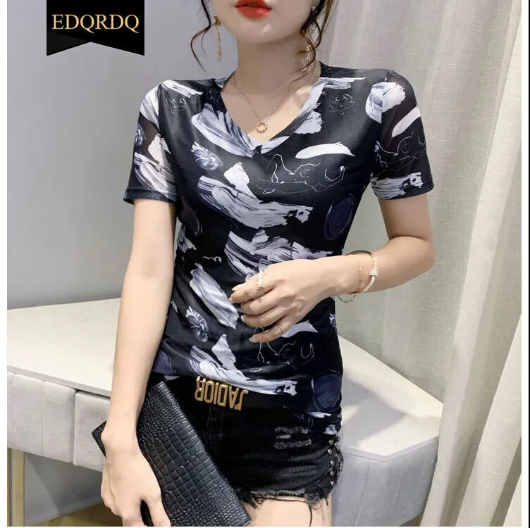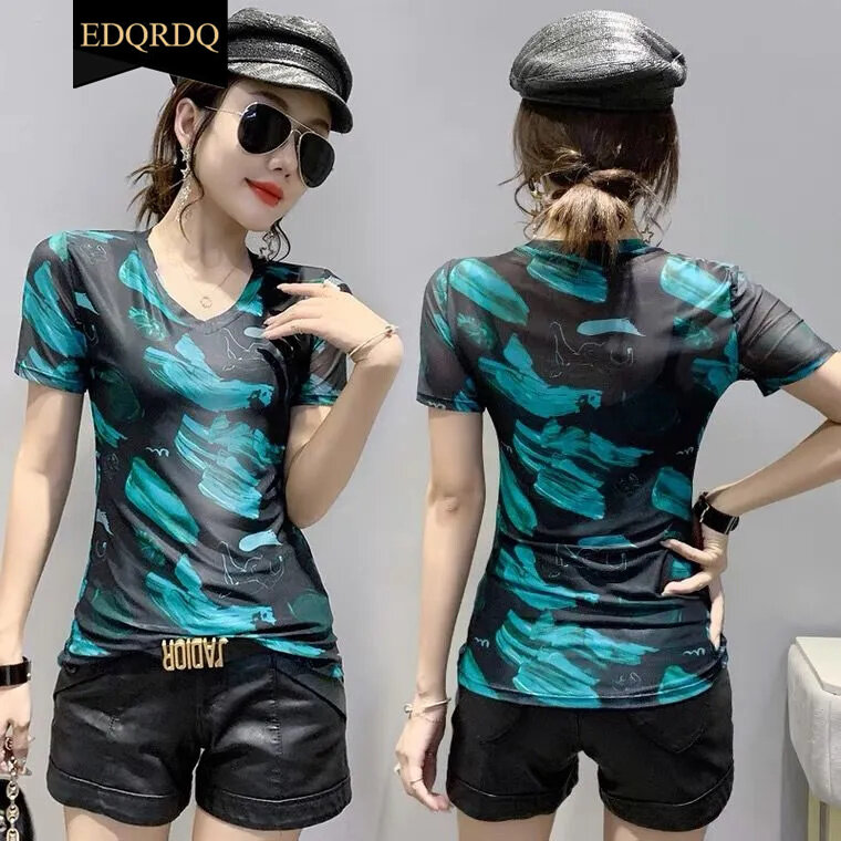 EDQRDQ Women's Short Sleeve Graphic Tee V Neck Casual Top Sheer Mesh Shirts