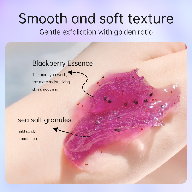 Product specification: 200mlProduct Name: Blackberry Peeling ScrubProduct ingredients: water, glycerin, beetroot, xylitol, acrylic acid, arbutin, butanediol, RUBUS VILOSUS, PKG-40, EDTA two dosesProduct efficacy: ―Contains blackberry extract, which cleans the skin while refreshing, nourishing and moisturizing, leaving the skin silky, moist and shiny after washing.How to use: Wet the area that needs to be scrubbed with warm water first, then take the size of your thumb and apply it evenly on the skin such as hands and feet, massage clockwise with moderate force for 2 to 3 minutes, until the dead skin is rubbed out, then rinse